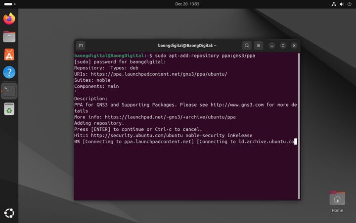Langkah pertama adalah menambahkan repository resmi GNS3 ke sistem. Repository ini berisi versi terbaru GNS3 yang memang dibuat untuk distro berbasis Ubuntu, termasuk Linux Mint.