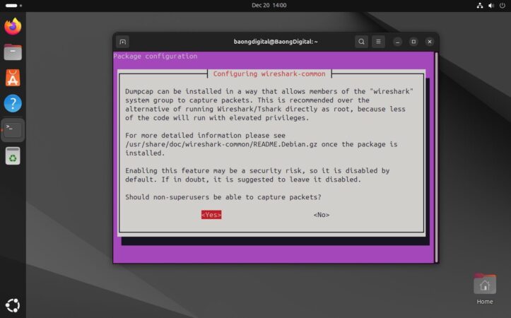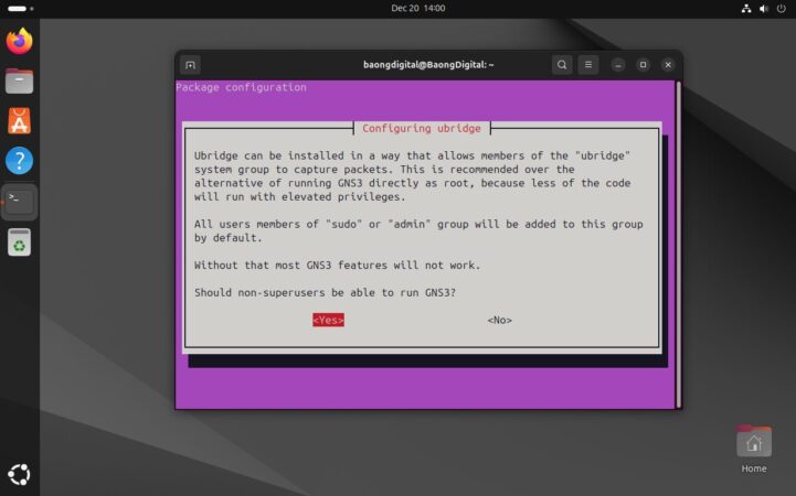 Saat proses instalasi berjalan, kamu akan mendapatkan beberapa pertanyaan penting. Pilih Yes saat diminta mengizinkan user non-root menjalankan GNS3 dan melakukan packet capture.