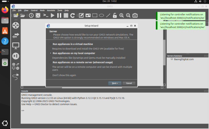 Saat pertama kali menjalankan GNS3, Setup Wizard akan muncul secara otomatis. Pilih opsi Run appliances on my local computer agar semua simulasi dijalankan langsung di sistem Linux kamu.