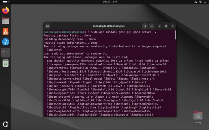 sudo apt install gns3-gui gns3-server -yPaket gns3-gui digunakan sebagai tampilan utama GNS3, sedangkan gns3-server berfungsi untuk menjalankan simulasi jaringan. Opsi -y digunakan agar proses instalasi berjalan otomatis tanpa konfirmasi tambahan.