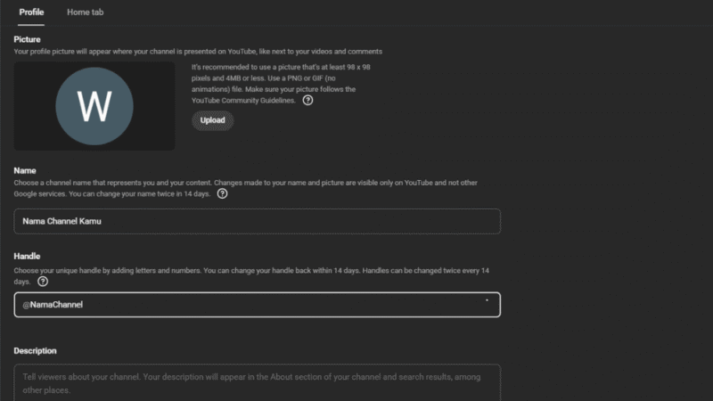 Masukkan nama channel sesuai niche konten. Kamu juga bisa mengatur handle channel (@username) agar lebih mudah dikenali.