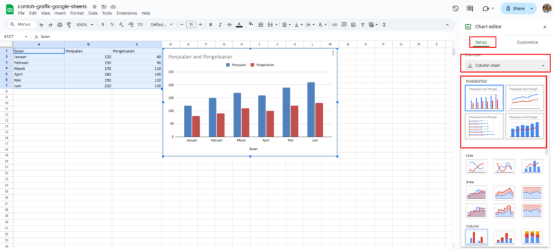 Di panel Chart editor, kamu bisa memilih jenis grafik yang diinginkan pada bagian Chart type. Jika grafik bawaan belum sesuai, tinggal ganti sesuai kebutuhan.