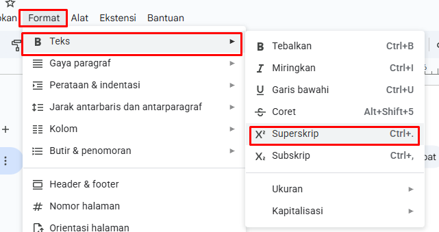 Cara paling dasar dan aman untuk membuat superscript adalah melalui menu Format. Metode ini cocok untuk kamu yang jarang menggunakan shortcut atau masih belajar fitur Google Docs.