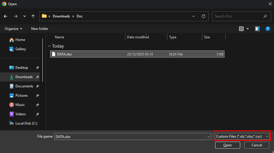 - Cari dan pilih file Excel dengan format